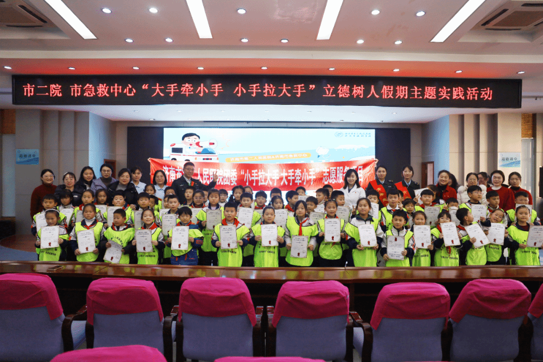 在为小服务阵地,寒假期间,市眼科医院(市二院)联合济南市急救中心,为天桥区枫景小学130余名学生开展“大手牵小手”沉浸式社会实践活动。志愿者们带来趣味近视防控科普、专业急救技能培训,通过实操教学、模型演示、急救车参观等形式,让孩子们轻松掌握科学用眼、心肺复苏、海姆立克急救等实用知识。活动干货满满、寓教于乐,有效填补假期安全教育与实践空白,获得师生与家长一致好评。学校特赠送锦旗,致谢市眼科医院(市二院)以专业守护青少年眼健康,用志愿服务为孩子们点亮成长之路。