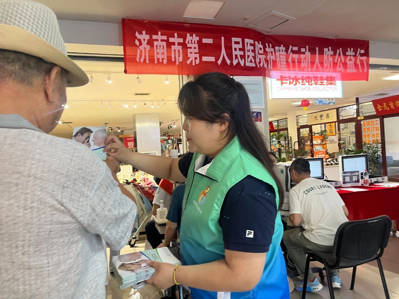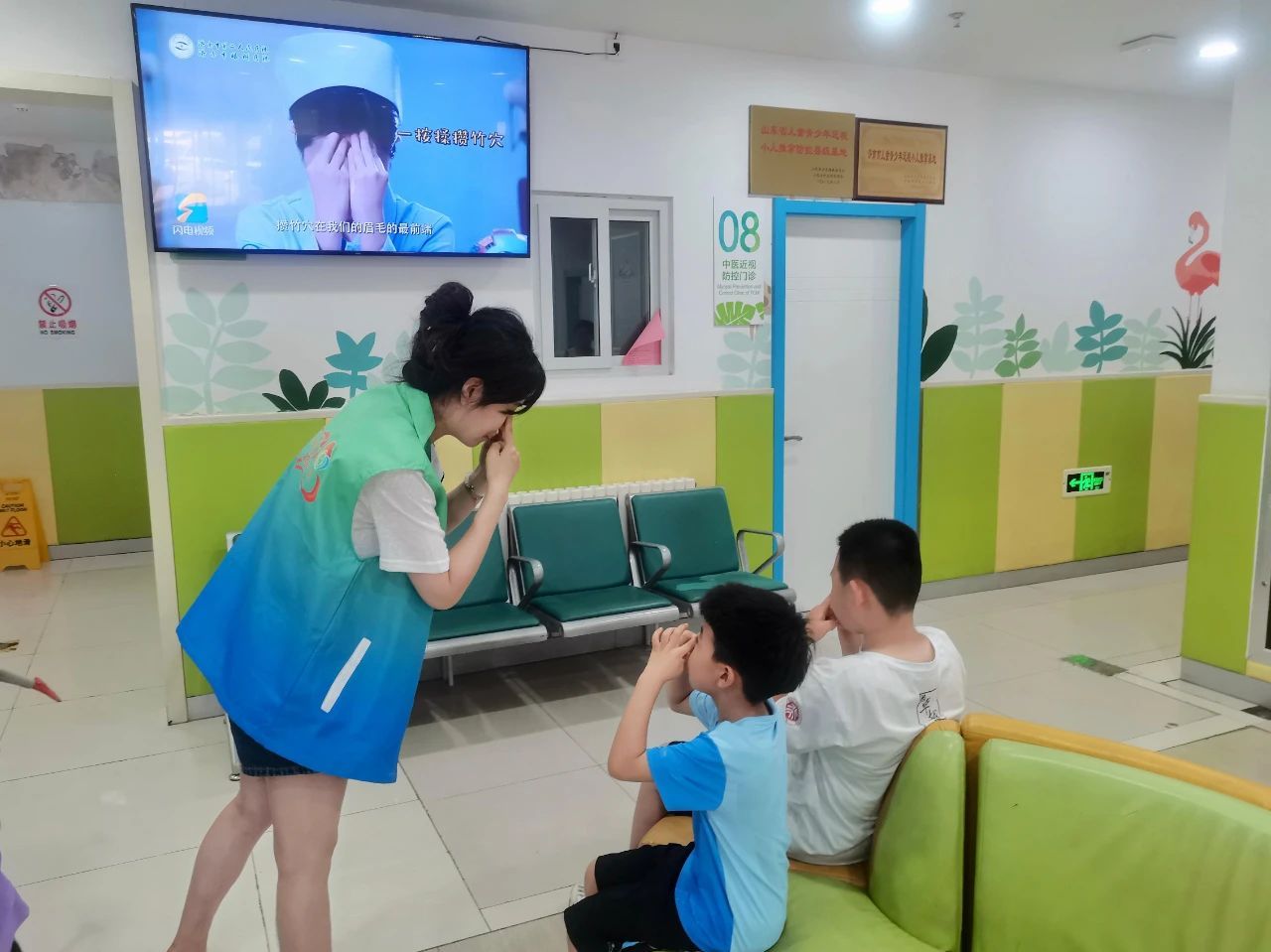)儿童眼科门诊大厅内,党员志愿者们在活动期间一早身穿蓝绿渐变马甲,每日轮流到门诊区域开展志愿服务。他们协助导医开展秩序维护、办理就诊卡充值、指导患者就医流程、耐心解答各类疑问、引导患者有序就诊,为患者和职工送上一杯杯解暑的绿豆汤,并积极开展科普宣教活动,这一系列举措,不仅缓解了门诊医护人员的工作压力,更让患者感受到了温暖。值得一提的是,今年以来,"党员示范岗"除门诊区域外,还走出医院,走进社区、商场、公园等公共场所,开展各类公益服务,把眼保健知识传授给广大市民群众,用实际行动诠释着党员的初心与使命。