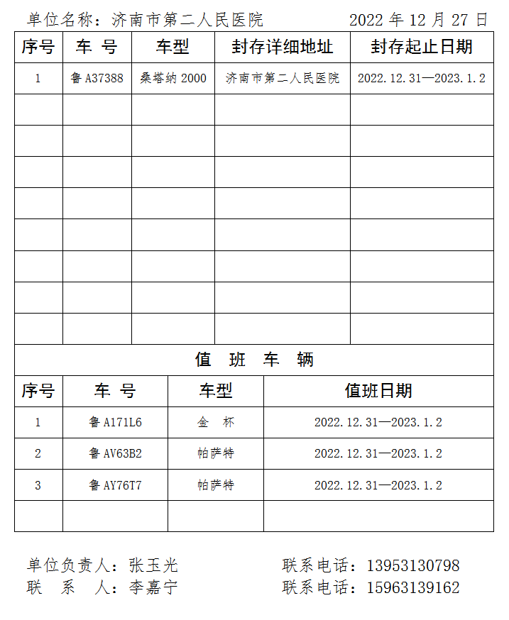 市二院元旦公务用车封存情况登记表