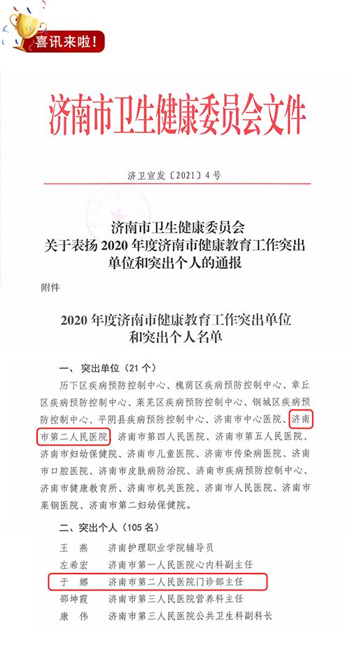 近日,济南市卫生健康委员会对2020年度济南市健康教育工作突出单位和突出个人进行了通报表彰,美女视频 荣获“健康教育工作突出单位”荣誉称号,门诊部主任于娜同志荣获“健康教育工作突出个人”荣誉称号。...