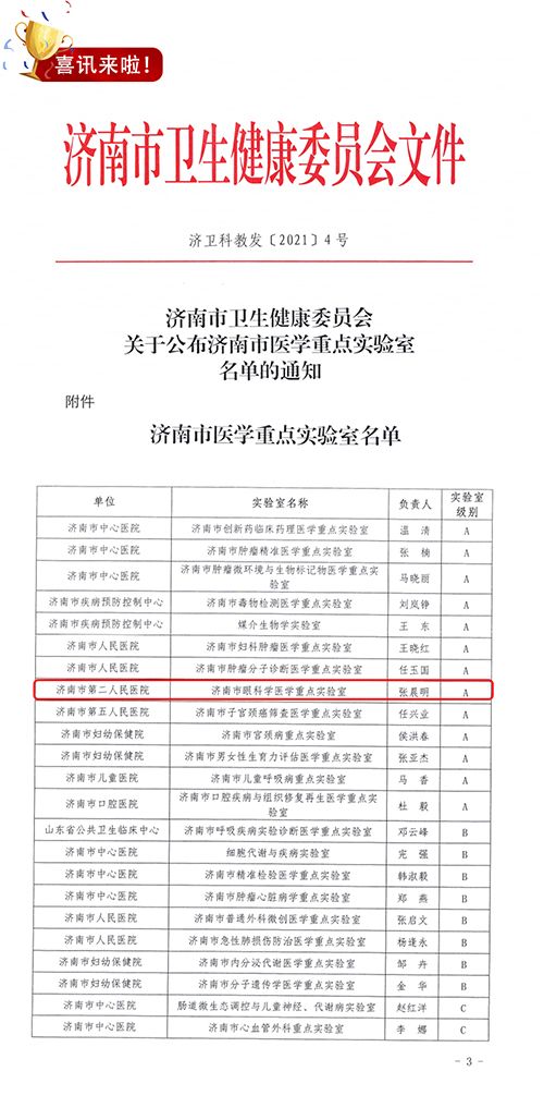 喜讯!济南市二院眼科学医学重点实验室获评济南市医学重点实验室