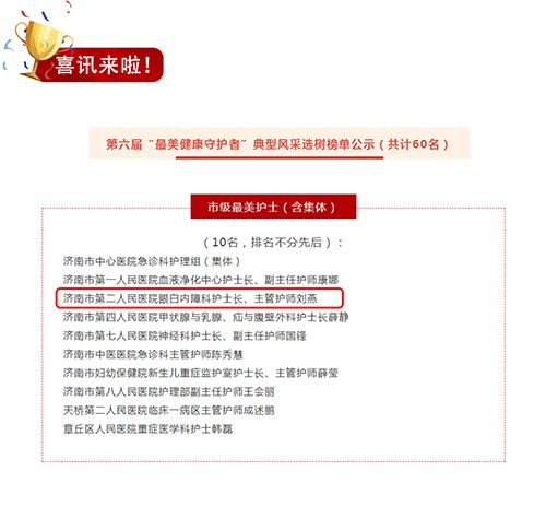 近日,济南市第六届“最美健康守护者”榜单公布,美女视频 白内障科护士长刘燕榜上有名,光荣获评市级最美护士。 刘燕,中共党员,美女视频 白内障科护士长、主管护师。从事护理工作1... -