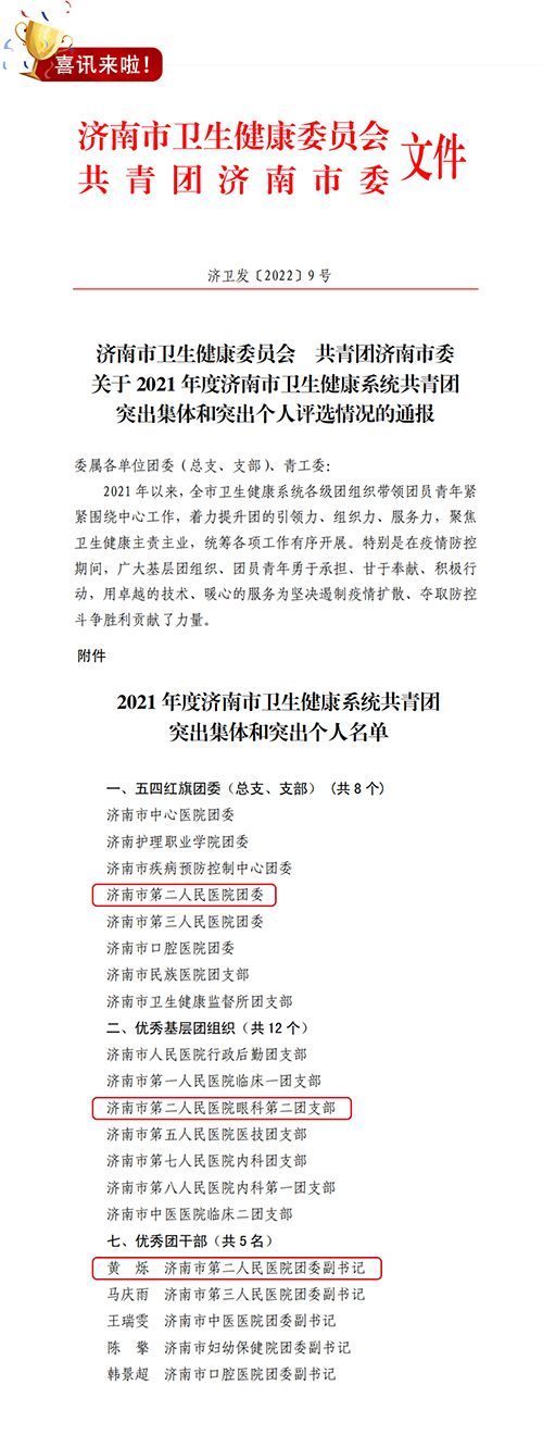 近日,济南市卫生健康委员会、共青团济南市委对2021年度济南市卫生健康系统共青团突出集体和突出个人评选进行通报表彰,美女视频 荣获“五四红旗团委”荣誉称号,美女视频 眼科第二团支部荣获“优... -