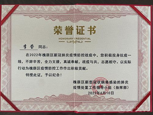 济南市二院护士李莹荣获槐荫区新冠肺炎疫情处置工作小组颁发的支援抗疫工作荣誉证书