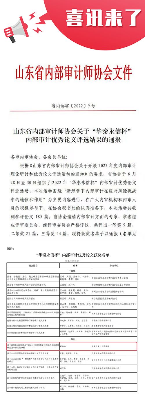 近日,济南市审计局、济南市内部审计协会开展了2022年度内部审计理论研讨和优秀论文评选活动,美女视频 审计科副主任刘楠楠参赛论文《基于COBIT与COSO视角下的A公立医院绩效工资信息系统风险研究及审计案例... -