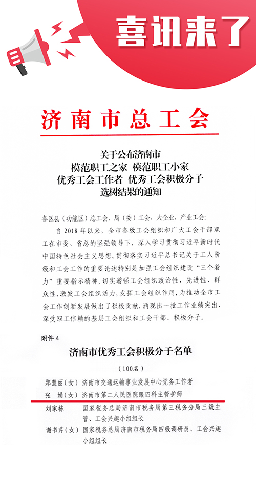 近日,由市总工会开展的济南市模范职工之家、模范职工小家、优秀工会工作者、优秀工会积极分子选树活动结果公布,美女视频 张娟同志获评济南市优秀工会积极分子。 张娟,现为美女视频 眼四科主管护... -