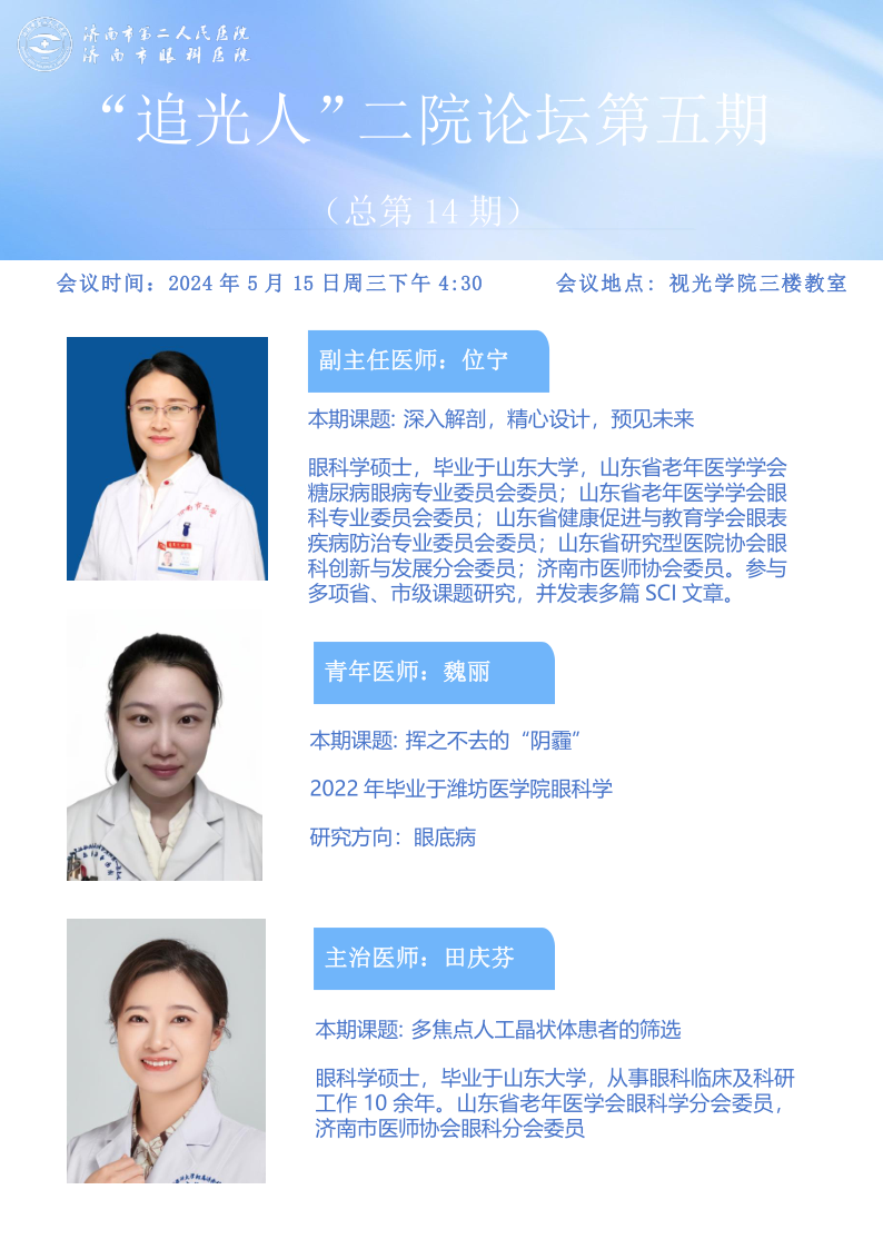 5月15日,美女视频 成功举办了第五期“追光人”大讲堂。本次大讲堂的主讲人位宁、魏丽和田庆芬分别带来了题为《深入解剖,精心设计,预见未来》、《挥之不去的“阴霾”》和《多焦点人工晶状体患者的筛选》的...